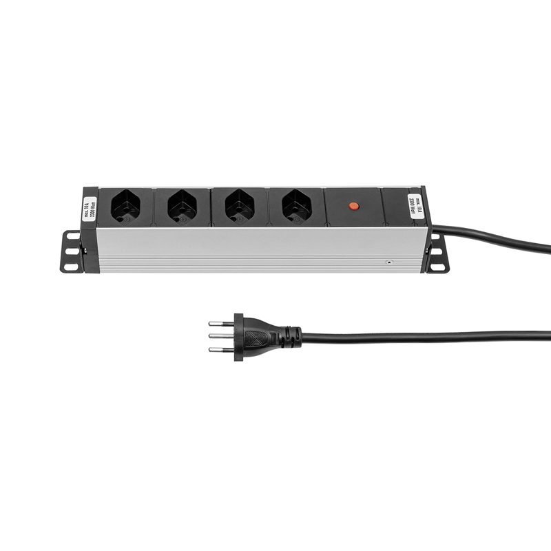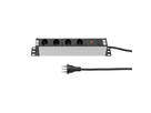 ALU MODULAR SILVER Steckdosenleiste 4xT13 längs, Kabel Td H05VV-F 3G1.5mm2 schwarz, Kabellänge 3m, Stecker T12 schwarz, Reset-Knopf (rückstellbarer Überstromschutz), inkl. modulare Befestigungswinkel (separat im Polybeutel verpackt), silber/schwarz
