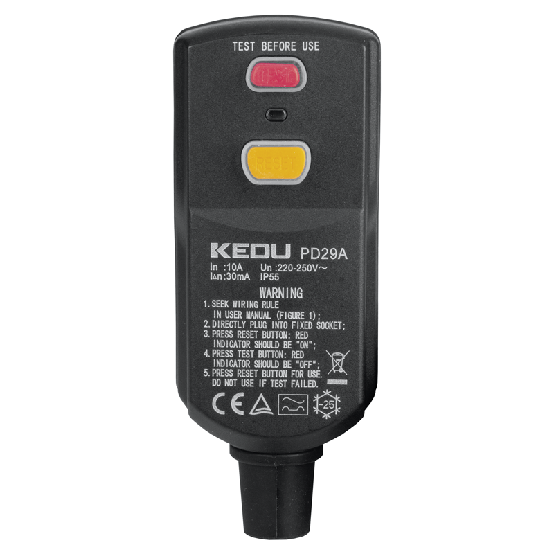 FI-Schutzstecker Typ 13 IP55 PRCD PROTECT, trennt die Zuleitung innert Millisekunden vom Netz (2-polige Abschaltung), Eingangsspannung: max. 250V, Nenndifferenzstrom: 30mA, Last: max. 10A, IP55, schwarz