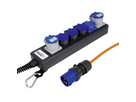 Steckdosenleiste PROFESSIONAL 2xCEE16/3 (IP44) + 3xT23 (IP55) + 1xSchuko (IP54), Kabel PUR H07BQ-F 3G2.5mm2 orange, Kabellänge 5m, Stecker CEE16/3 blau, Karabinderhaken, Farbe schwarz/blau