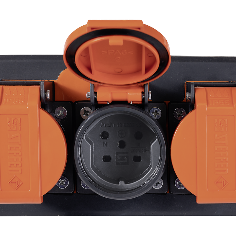 Steckdosenleiste PROFESSIONAL 3xT15 quer, Kabel GdV H07RN-F 5G1.5mm2 schwarz, Kabellänge 3m, Stecker T15, Karabinerhaken, IP55, schwarz/orange