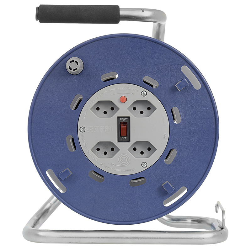 Avvolgicavo in plastica LOOP 4xT13, cavo Td H05VV-F 3G1mm2 giallo, lunghezza del cavo 25m, spina T12, interruttore ON-OFF illuminato, disgiuntore termico, freno a cono brevettato, guida cavo, blu/grigio